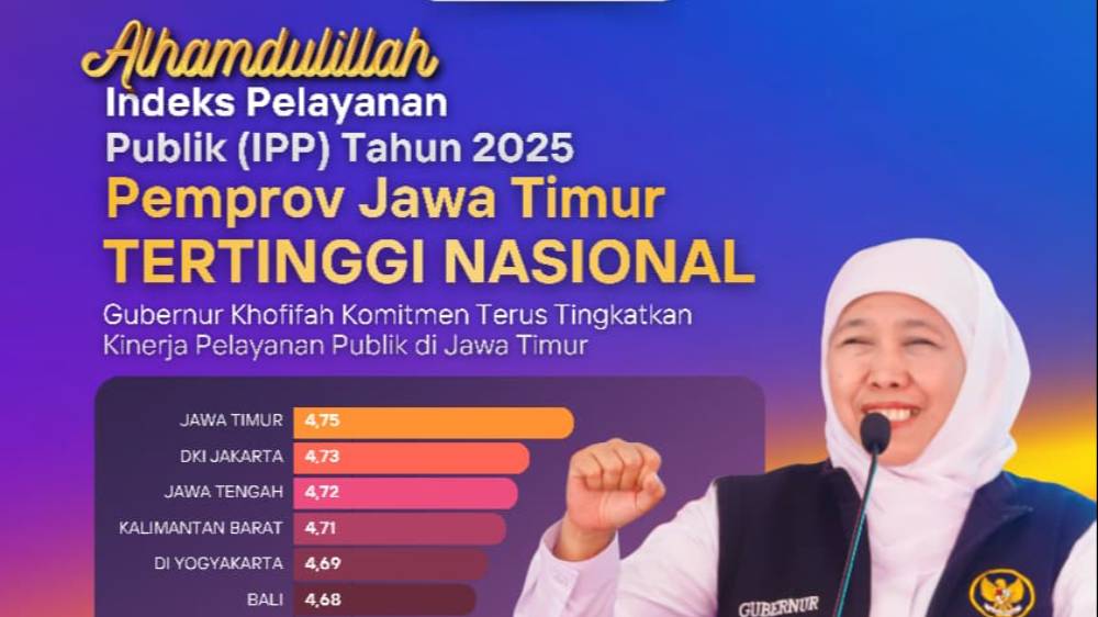 “Alhamdulillah, berdasarkan penetapan Kementerian PANRB, Jawa Timur dinyatakan sebagai provinsi dengan kinerja pelayanan publik terbaik tahun 2025. Ini bukan sekadar prestasi, tetapi amanah untuk terus menjaga dan meningkatkan kualitas pelayanan kepada masyarakat,” kata Khofifah di Surabaya, Minggu (1/2).
