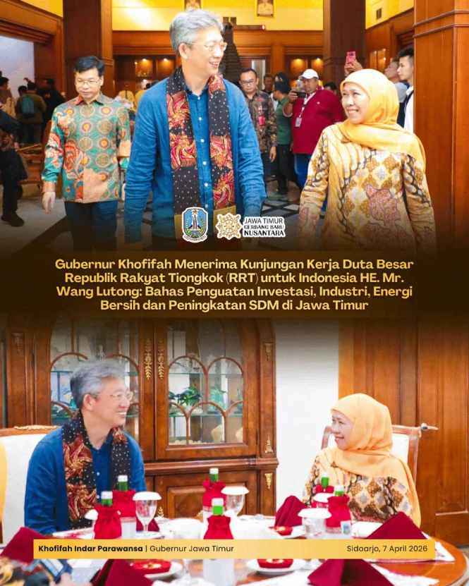 ENTERJATIM.COMSIDOARJO, 8 APRIL 2026 – Gubernur Jawa Timur Khofifah Indar Parawansa membahas penguatan kerja sama strategis di berbagai sektor, mulai dari investasi, industri, energi terbarukan, hingga pengembangan sumber daya manusia (SDM) saat menerima kunjungan kerja Duta Besar Republik Rakyat Tiongkok (RRT) untuk Indonesia HE. Mr. Wang Lutong di Gedung VIP Bandara Juanda, Sidoarjo, pada Selasa (7/4).