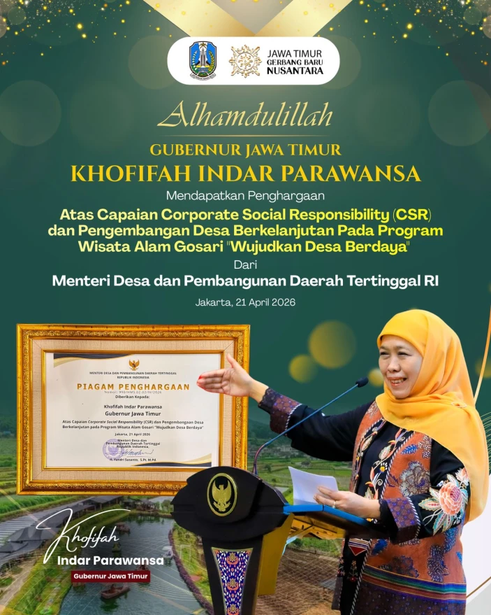 ENTERJATIM.COM – Surabaya, 24 April 2026 – Gubernur Jawa Timur Khofifah Indar Parawansa menerima penghargaan Corporate Social Responsibility (CSR) dan Pengembangan Desa Berkelanjutan (PDB) Award 2026 dari Kementerian Desa dan Pembangunan Daerah Tertinggal. Penghargaan ini diraih melalui keberhasilan Program Wisata Alam Gosari bertajuk “Wujudkan Desa Berdaya”.