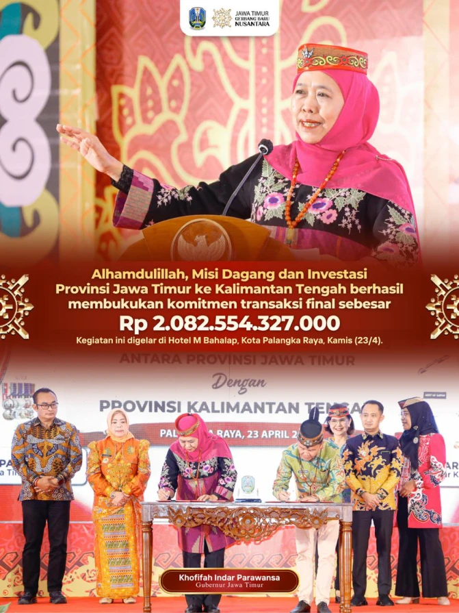 ENTERJATIM.COM –Palangka Raya, 24 April 2026 — Khofifah Indar Parawansa memimpin langsung Misi Dagang dan Investasi Provinsi Jawa Timur ke Kalimantan Tengah yang berhasil mencatatkan komitmen transaksi final mencapai Rp2.082.554.327.000 hingga pukul 17.00 WIB. Kegiatan tersebut berlangsung di Hotel M Bahalap, Kamis (23/4).