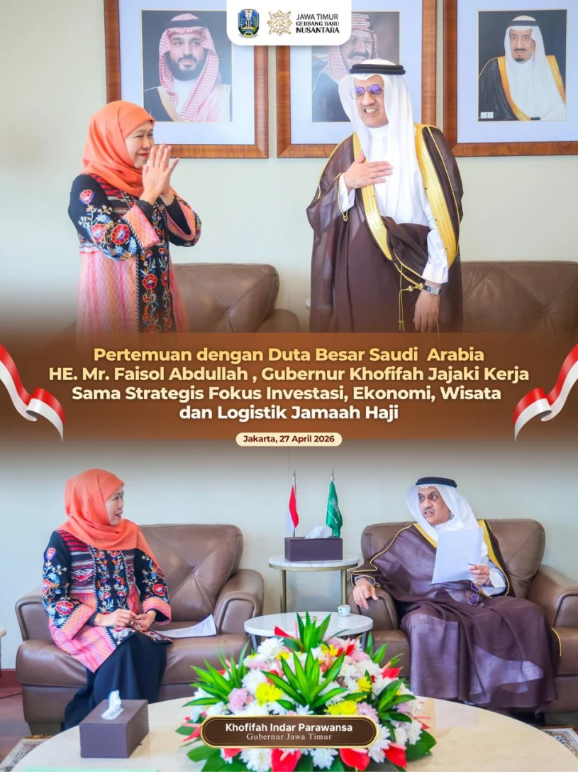 ENTERJATIM.COM – JAKARTA, 28 April 2026 – Gubernur Jawa Timur Khofifah Indar Parawansa menjajaki peluang kerja sama strategis dengan Pemerintah Kerajaan Arab Saudi dalam berbagai sektor, mulai dari investasi, ekonomi, pariwisata hingga logistik jamaah haji.